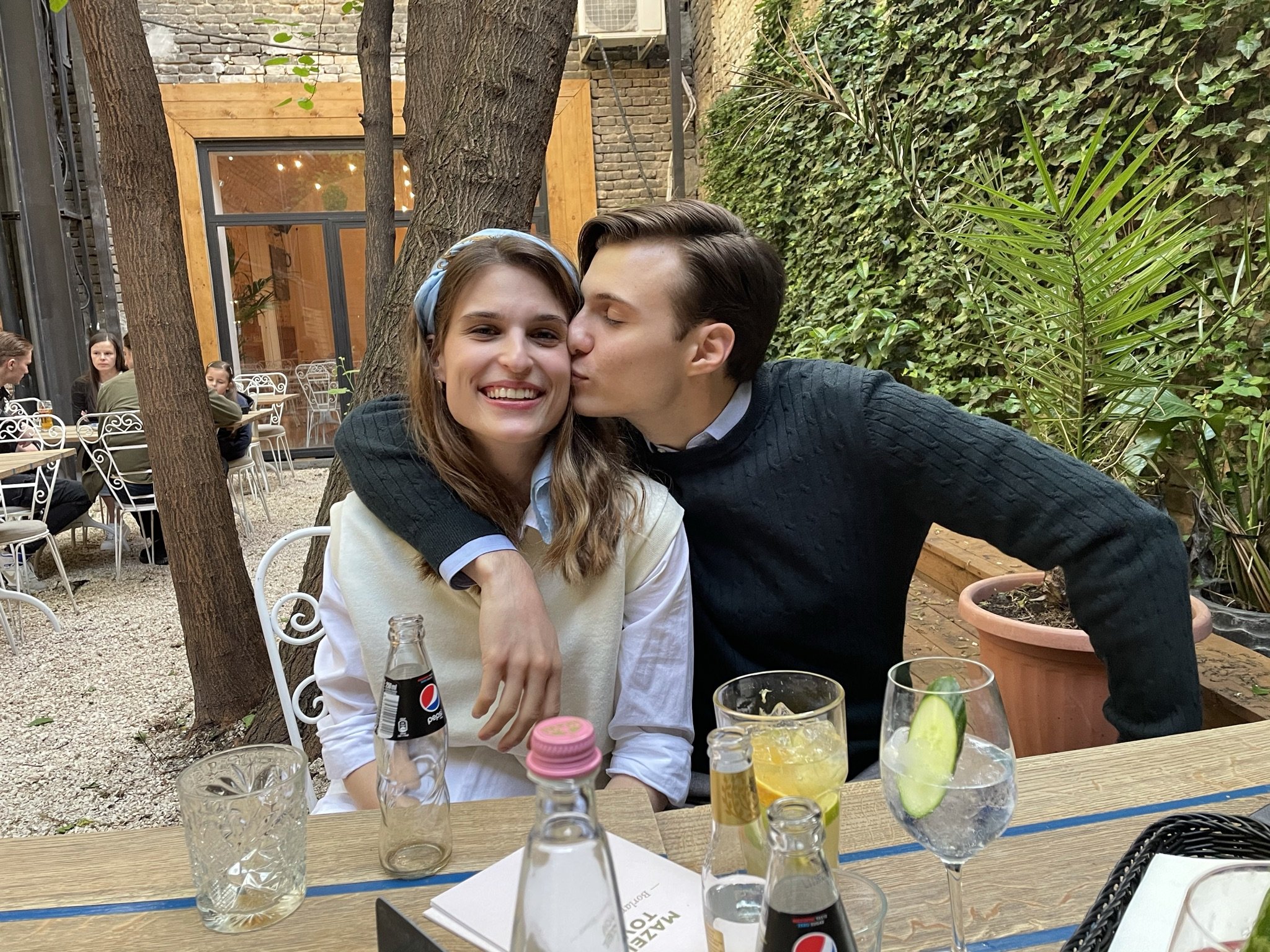 Milán and Dóra met just before the hectic years of COVID. One evening, Milán was swiping on Tinder when he came across a girl named Dóra - and immediately hit “super like.” They met just before Christmas at the Vörösmarty tér Christmas Market, right in front of Gerbeaud. What was meant to be a short meeting turned into hours of walking and talking - about Máté Péter’s songs, life abroad as Hungarians, and their shared love of túrógombóc.